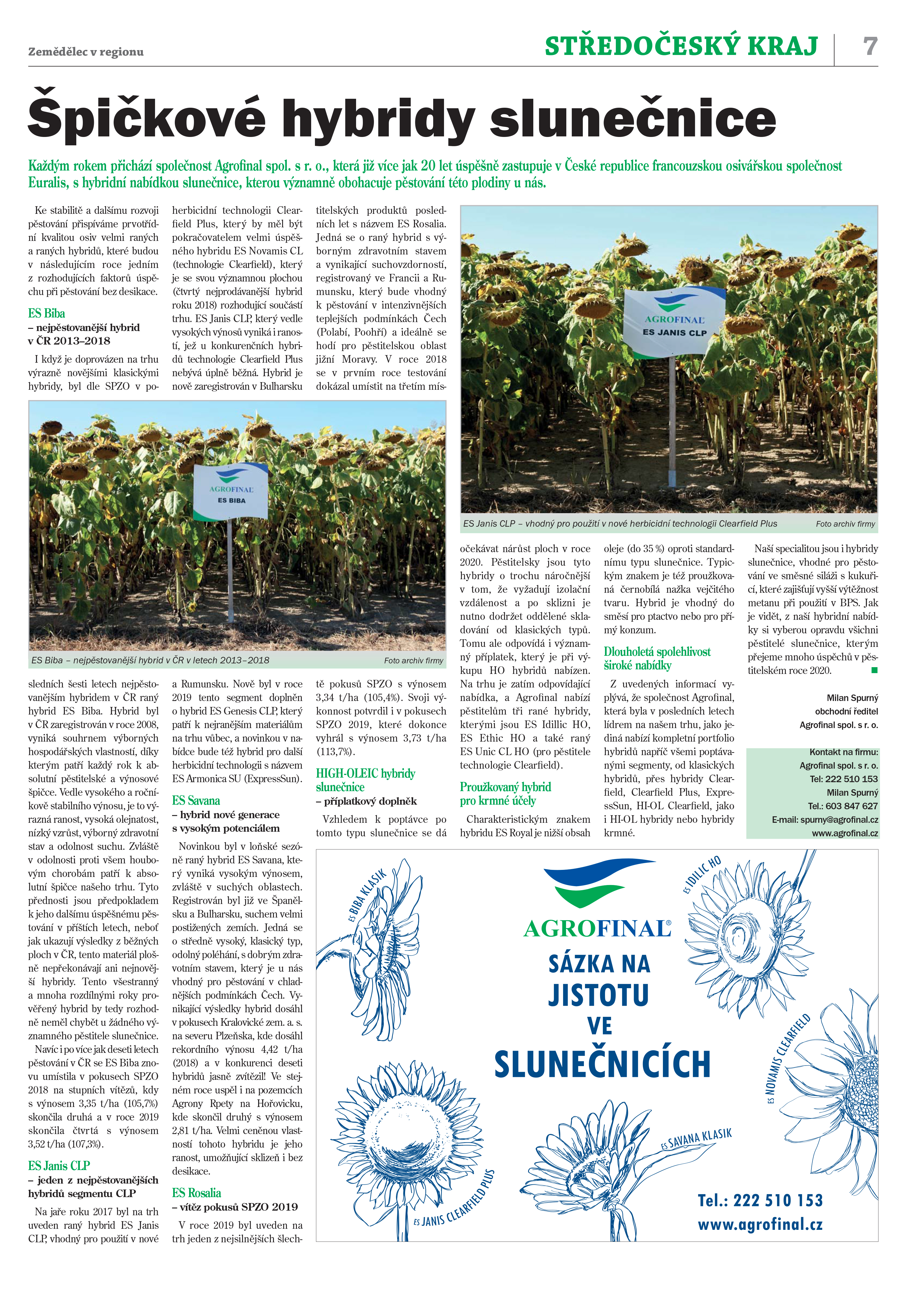 Z uvedených informací vyplývá, že společnost Agrofi nal, která byla v posledních letech lídrem na našem trhu, jako jediná nabízí kompletní portfolio hybridů napříč všemi poptávanými segmenty, od klasických hybridů, přes hybridy Clearfi eld, Clearfi eld Plus, ExpressSun, HI-OL Clearfi eld, jako i HI-OL hybridy nebo hybridy krmné. Naší specialitou jsou i hybridy slunečnice, vhodné pro pěstování ve směsné siláži s kukuřicí, které zajišťují vyšší výtěžnost metanu při použití v BPS. Jak je vidět, z naší hybridní nabídky si vyberou opravdu všichni pěstitelé slunečnice, kterým přejeme mnoho úspěchů v pěstitelském roce 2020.