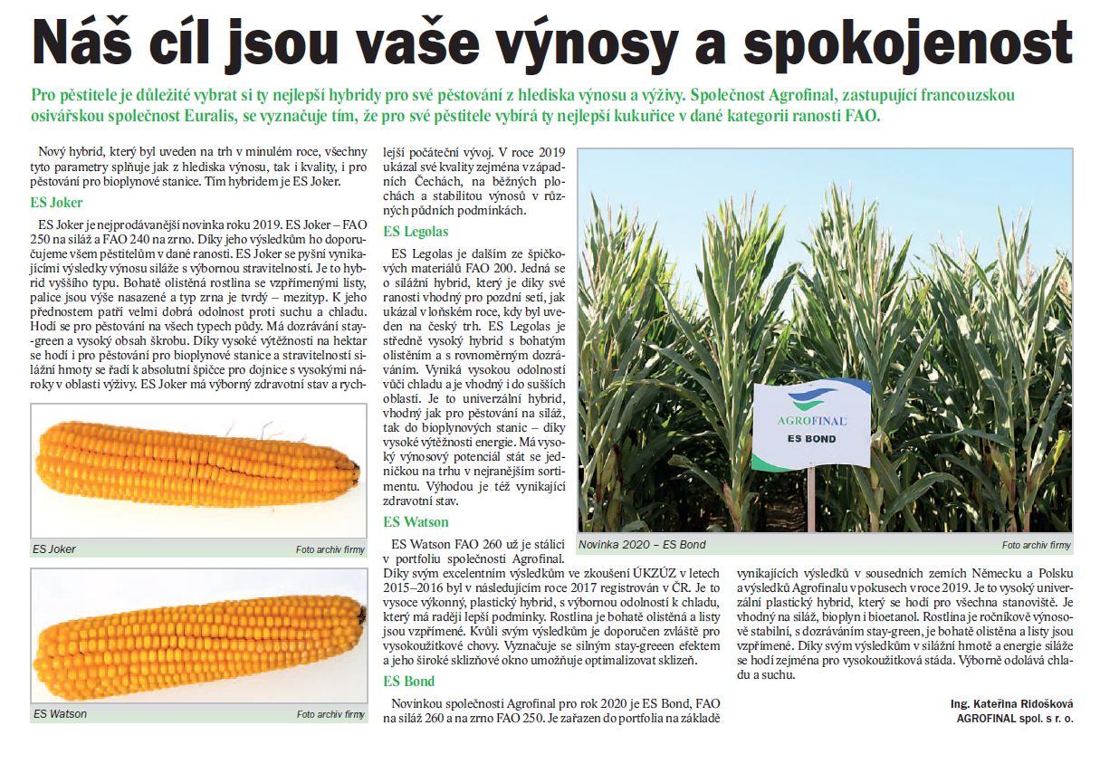 Novinkou společnosti Agrofinal pro rok 2020 je ES Bond, FAO na siláž 260 a na zrno FAO 250. Je zařazen do portfolia na základě vynikajících výsledků v sousedních zemích Německu a Polsku a výsledků Agrofinalu v pokusech v roce 2019. Je to vysoký univerzální plastický hybrid, který se hodí pro všechna stanoviště. Je vhodný na siláž, bioplyn i bioetanol. Rostlina je ročníkově výnosově stabilní, s dozráváním stay-green, je bohatě olistěna a listy jsou vzpřímené. Díky svým výsledkům v silážní hmotě a energie siláže se hodí zejména pro vysokoužitková stáda. Výborně odolává chladu a suchu.
