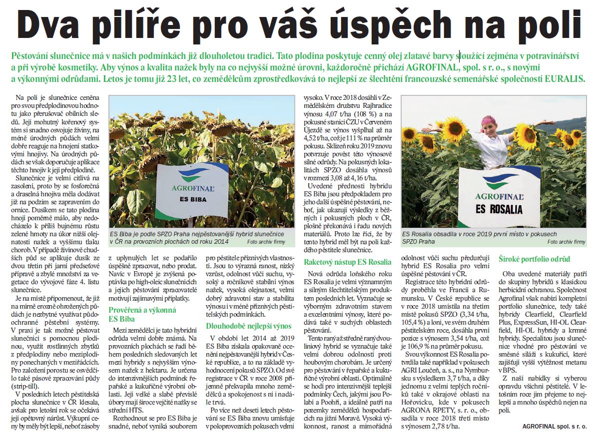 Pěstování slunečnice má v našich podmínkách již dlouholetou tradici. Tato plodina poskytuje cenný olej zlatavé barvy sloužící zejména v potravinářství a při výrobě kosmetiky. Aby výnos a kvalita nažek byly na co nejvyšší možné úrovni, každoročně přichází AGROFINAL, spol. s r. o., s novými a výkonnými odrůdami. Letos je tomu již 23 let, co zemědělcům zprostředkovává to nejlepší ze šlechtění francouzské semenářské společnosti EURALIS.