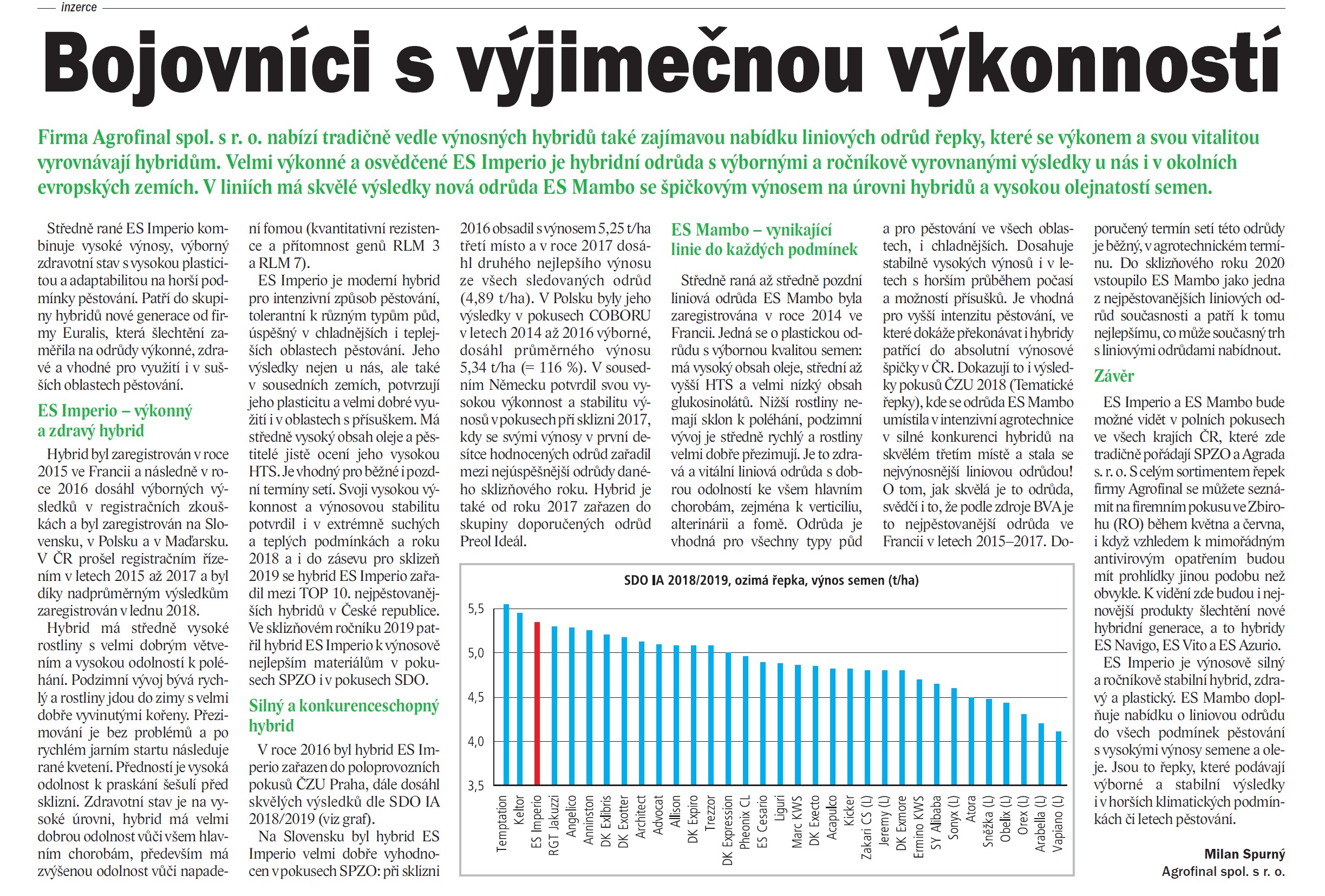 Firma Agrofinal spol. s r. o. nabízí tradičně vedle výnosných hybridů také zajímavou nabídku liniových odrůd řepky, které se výkonem a svou vitalitou vyrovnávají hybridům. Velmi výkonné a osvědčené ES Imperio je hybridní odrůda s výbornými a ročníkově vyrovnanými výsledky u nás i v okolních evropských zemích. V liniích má skvělé výsledky nová odrůda ES Mambo se špičkovým výnosem na úrovni hybridů a vysokou olejnatostí semen.