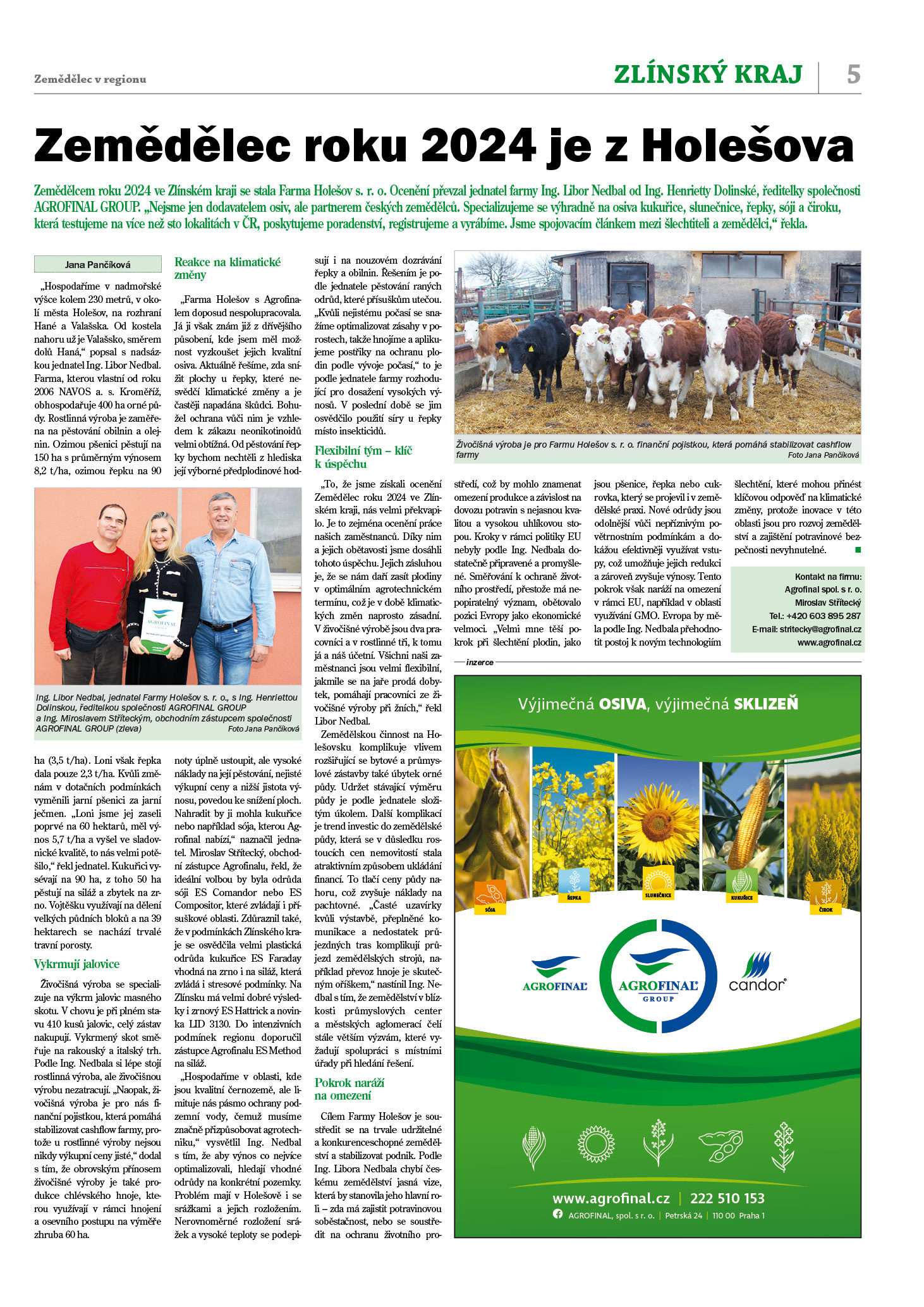 Zemědělcem roku 2024 ve Zlínském kraji se stala Farma Holešov s. r. o. Ocenění převzal jednatel farmy Ing. Libor Nedbal od Ing. Henrietty Dolinské, ředitelky společnosti AGROFINAL GROUP. „Nejsme jen dodavatelem osiv, ale partnerem českých zemědělců. Specializujeme se výhradně na osiva kukuřice, slunečnice, řepky, sóji a čiroku, která testujeme na více než sto lokalitách v ČR, poskytujeme poradenství, registrujeme a vyrábíme. Jsme spojovacím článkem mezi šlechtiteli a zemědělci,“ řekla.