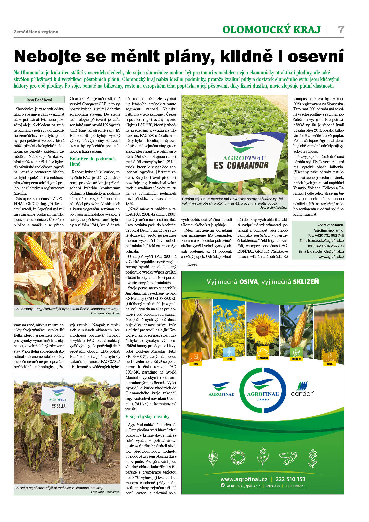 Zástupce společnosti AGROFINAL GROUP Ing. Jiří Kratochvíl uvedl, že Agrofinal má velmi významné postavení na trhu s osivem slunečnice v České republice a zaměřuje se především na rané, nízké a zdravé odrůdy. Svojí výměrou vyniká ES Bella, kterou si pěstitelé oblíbili pro vysoký výnos nažek a olejnatost, a velmi dobrý zdravotní stav. V portfoliu společnosti Agrofinal nalezneme také odrůdy slunečnice určené pro speciální herbicidní technologie. „Pro Clearfield Plus je určen středně vysoký Conquest CLP, je to výnosný hybrid s velmi dobrým zdravotním stavem. Do stejné technologie pěstování je zařazen také raný hybrid ES Agraris CLP. Raný až středně raný ES Hudson SU poskytuje vysoký výnos, má výjimečný zdravotní stav a byl vyšlechtěn pro technologii ExpressSun.
