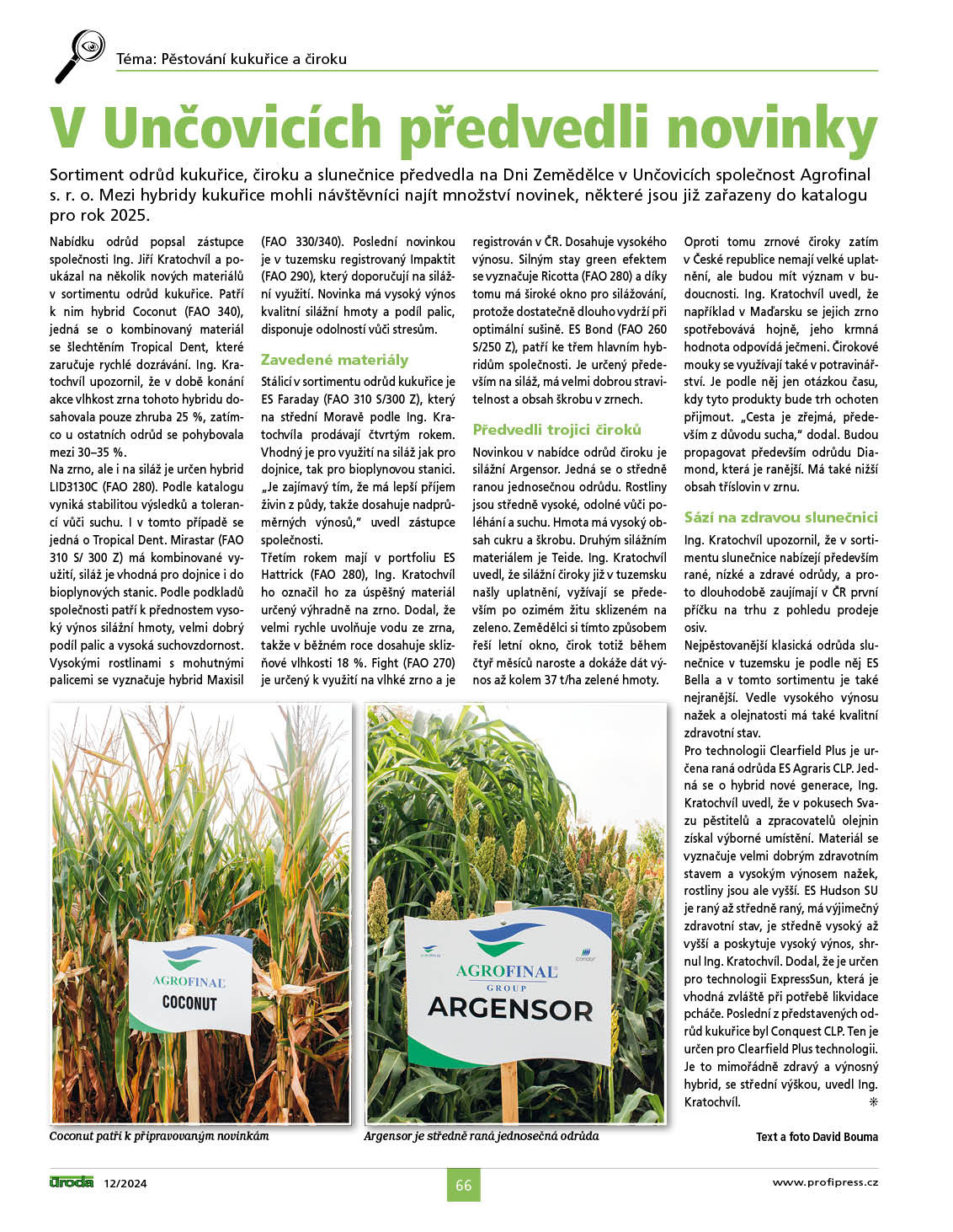 Sortiment odrůd kukuřice, čiroku a slunečnice předvedla na Dni Zemědělce v Unčovicích společnost Agrofinal s. r. o. Mezi hybridy kukuřice mohli návštěvníci najít množství novinek, některé jsou již zařazeny do katalogu pro rok 2025.