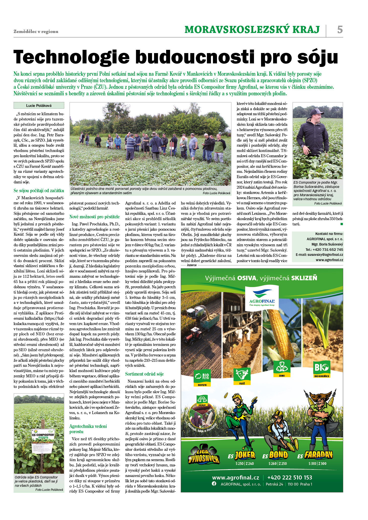 Nasazení lusků na obou odrůdách sóje zařazených do pokusu bylo podle slov Ing. Mičky velmi pěkné. ES Compositor je podle Mgr. Borise Sušovského, zástupce společnosti Agrofinal s. r. o. pro Moravskoslezský kraj, velice vhodnou odrůdou pro tuto oblast. Také ji zde na několika lokalitách množí, protože zastávají názor, že nejlepší osivo je přímo z dané geografické oblasti. ES Compositor dorůstá středního až vyššího vzrůstu, vyznačuje se bílým pupkem na semenu. Rostliny tvoří vrcholový hrozen, mají vysoký počet lusků a vysoké nasazení prvního lusku. Několik let po sobě tato stonková odrůda v Moravskoslezském kraji dosáhla podle Mgr. Sušovského velmi dobrých výsledků. Vyniká dobrým zdravotním stavem a je vhodná pro potravinářské využití. Ve svém portfoliu nabízí Agrofinal také nejranější, čtyřnulovou odrůdu sóje Obelix. Její množitelské plochy jsou na Frýdecko-Místecku, na jedné z chladnějších lokalit v ČR (vysoká nadmořská výška, těžké půdy). „Klademe důraz na velmi dobré genetické založení, které v této lokalitě množená sója získá a dokáže se pak dobře adaptovat na těžší pěstební podmínky. Loni se v Moravskoslezském kraji sklízela tato odrůda s hektarovým výnosem přes tři tuny,“ uvedl Mgr. Sušovský. Podle něj by si měl pěstitel zvolit ranější i pozdnější odrůdy, aby mohl sklízet kontinuálně. Třínulová odrůda ES Comandor je asi o tři dny ranější než ES Compositor, ale má keříčkovou formu.