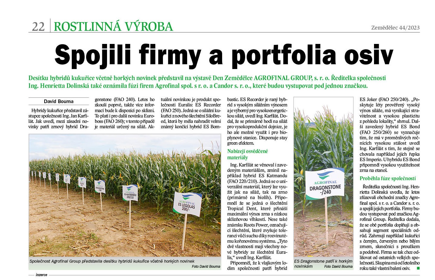Ředitelka společnosti Ing. Hen­rietta Dolinská uvedla, že letos zfúzovali obchodní značky Agrofinal spol. s r. o. a Candor s. r. o. a spojili jejich portfolia. Firmy budou vystupovat pod značkou Agrofinal Group. Ředitelka dodala, že se obě portfolia doplňují a obsahují segment speciálních odrůd. Zahrnují například kukuřici s černým, červeným nebo bílým zrnem, slunečnici s proužkem a podobně. Firma se tak chce odlišovat od ostatních velkých společností. Skupina má od letošního roku také vlastní balení osiv.