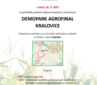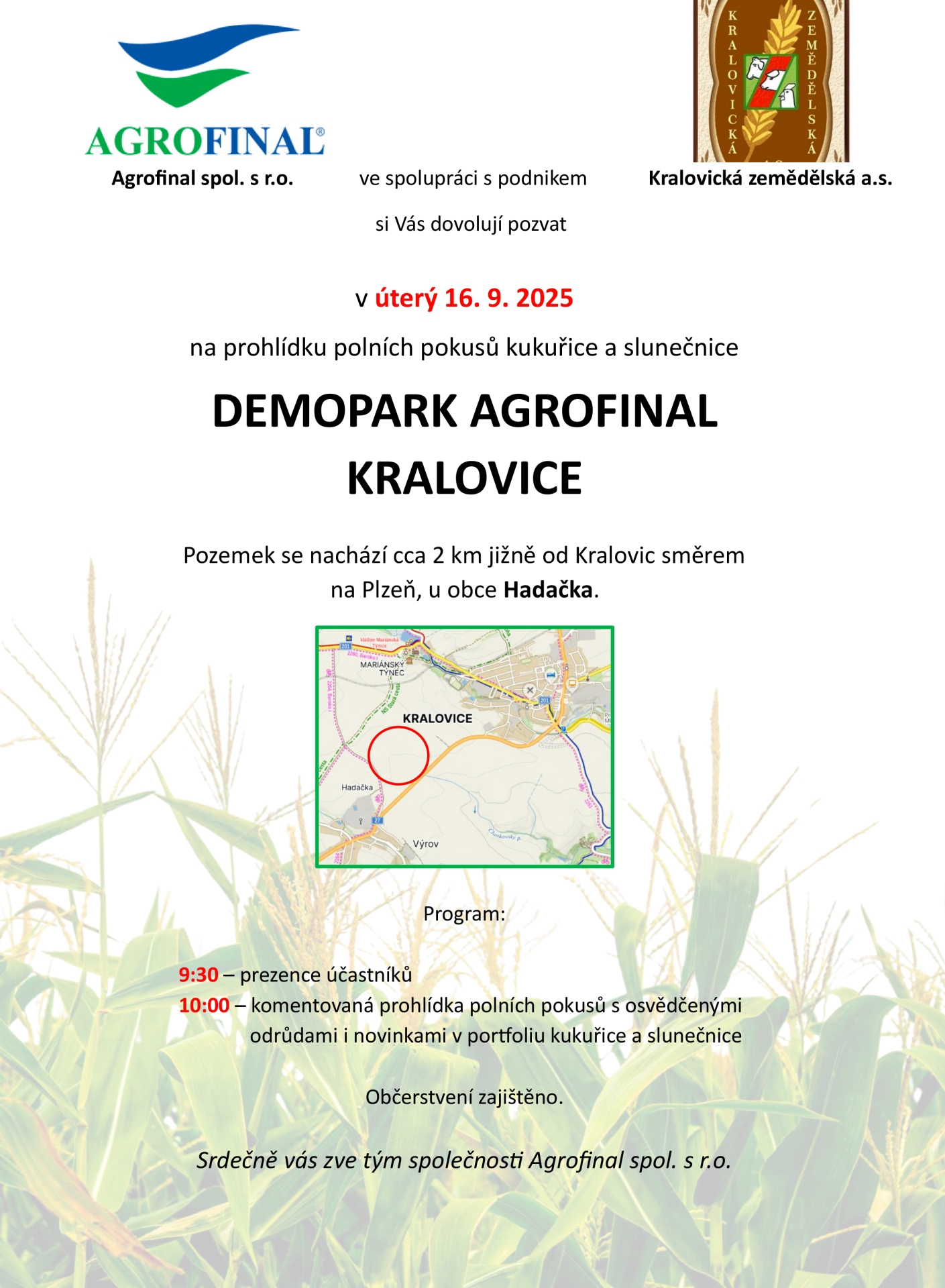Agrofinal spol. s r.o. ve spolupráci s podnikem Kralovická zemědělská a.s. si Vás dovolují pozvat v úterý 16. 9. 2025 na prohlídku polních pokusů kukuřice a slunečnice DEMOPARK AGROFINAL