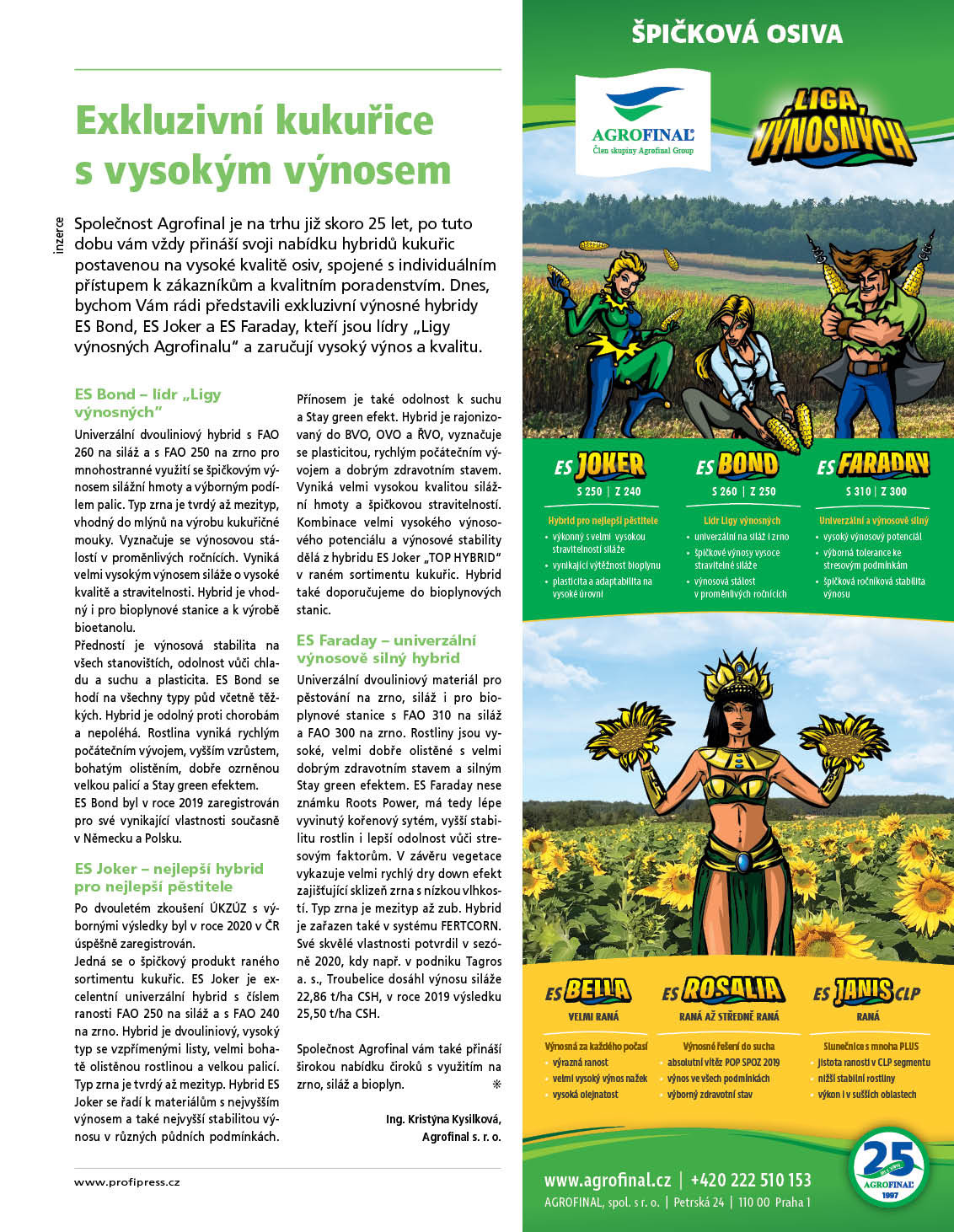 Společnost Agrofinal je na trhu již skoro 25 let, po tuto dobu vám vždy přináší svoji nabídku hybridů kukuřic postavenou na vysoké kvalitě osiv, spojené s individuálním přístupem k zákazníkům a kvalitním poradenstvím. Dnes, bychom Vám rádi představili exkluzivní výnosné hybridy ES Bond, ES Joker a ES Faraday, kteří jsou lídry „Ligy výnosných Agrofinalu“ a zaručují vysoký výnos a kvalitu.