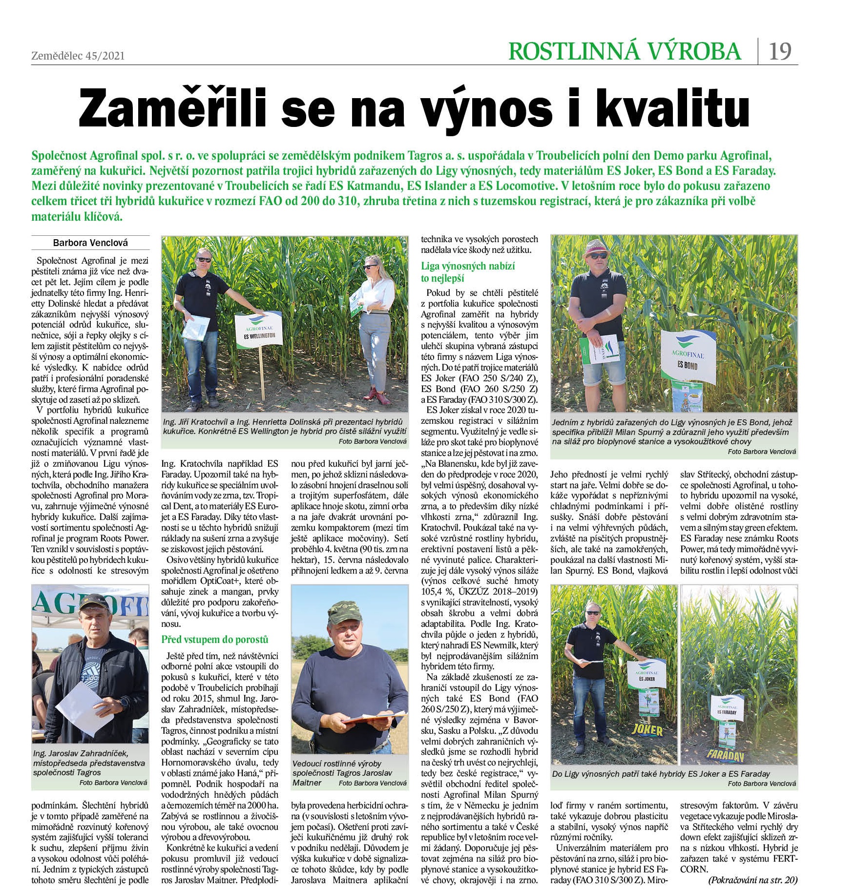 Společnost Agrofinal spol. s r. o. ve spolupráci se zemědělským podnikem Tagros a. s. uspořádala v Troubelicích polní den Demo parku Agrofinal, zaměřený na kukuřici. Největší pozornost patřila trojici hybridů zařazených do Ligy výnosných, tedy materiálům ES Joker, ES Bond a ES Faraday. Mezi důležité novinky prezentované v Troubelicích se řadí ES Katmandu, ES Islander a ES Locomotive. V letošním roce bylo do pokusu zařazeno celkem třicet tři hybridů kukuřice v rozmezí FAO od 200 do 310, zhruba třetina z nich s tuzemskou registrací, která je pro zákazníka při volbě materiálu klíčová.