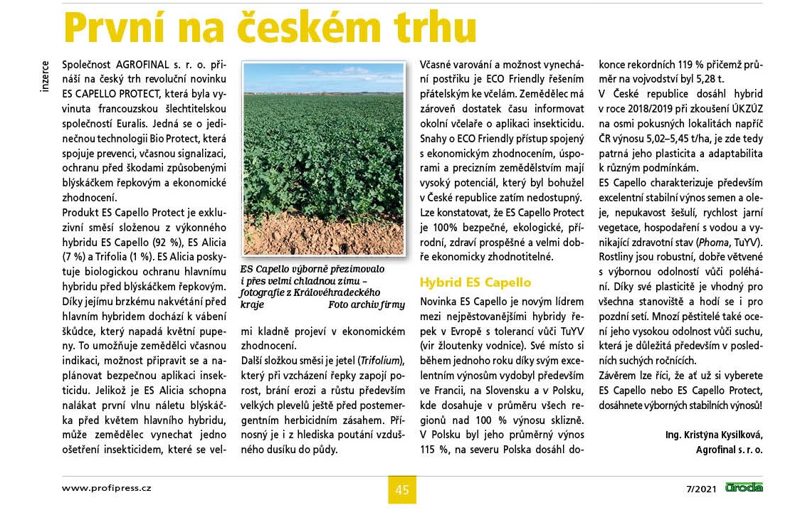 Společnost AGROFINAL s. r. o. přináší na český trh revoluční novinku ES CAPELLO PROTECT, která byla vyvinuta francouzskou šlechtitelskou společností Euralis. Jedná se o jedinečnou technologii Bio Protect, která spojuje prevenci, včasnou signalizaci, ochranu před škodami způsobenými blýskáčkem řepkovým a ekonomické zhodnocení.