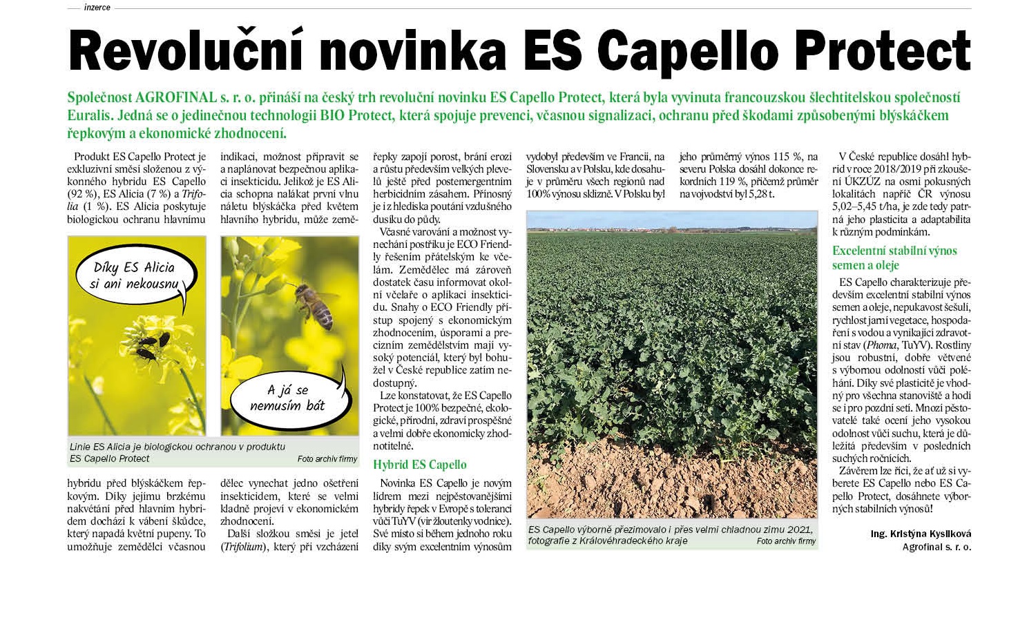 Společnost AGROFINAL s. r. o. přináší na český trh revoluční novinku ES Capello Protect, která byla vyvinuta francouzskou šlechtitelskou společností Euralis. Jedná se o jedinečnou technologii BIO Protect, která spojuje prevenci, včasnou signalizaci, ochranu před škodami způsobenými blýskáčkem řepkovým a ekonomické zhodnocení.