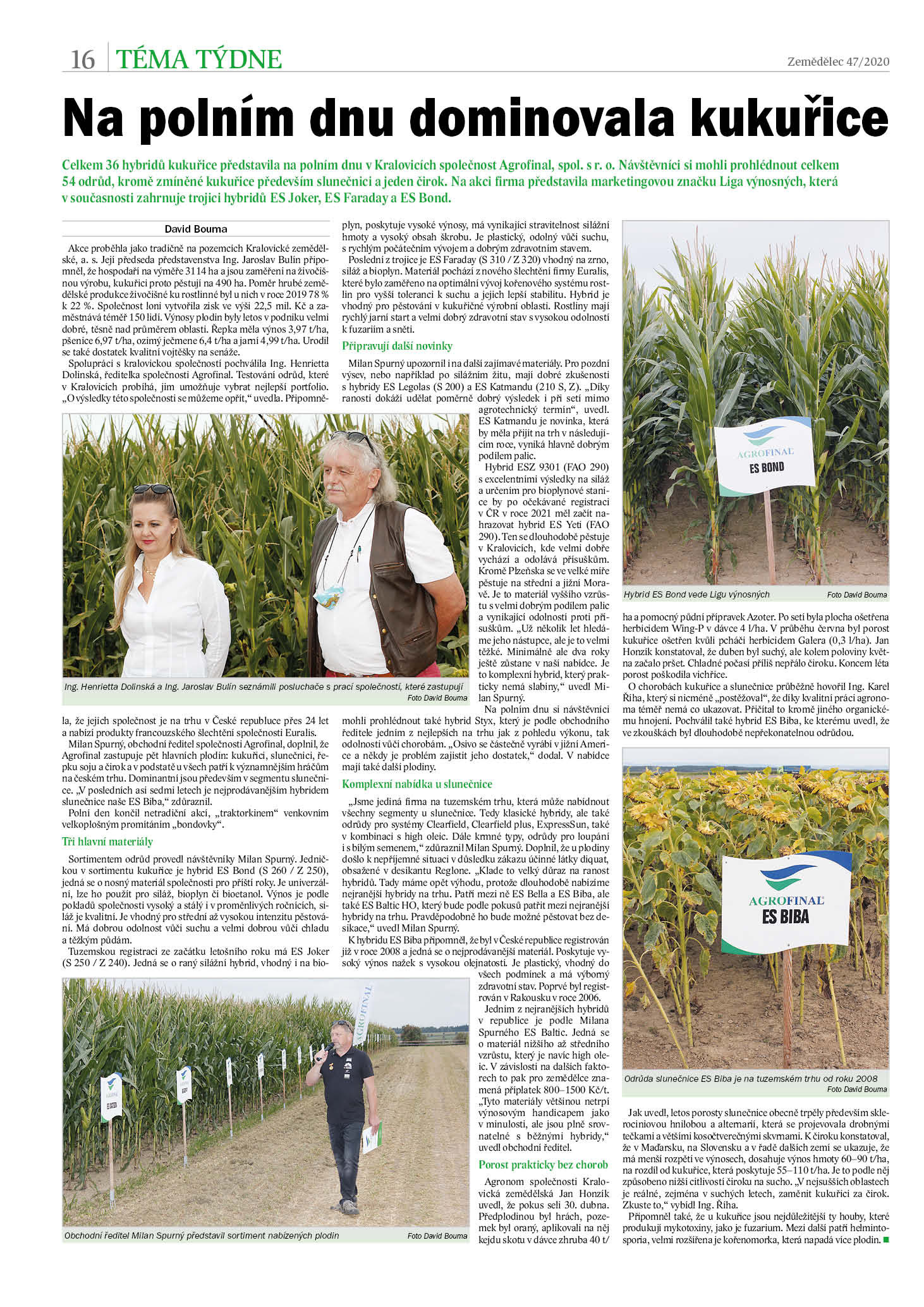 Celkem 36 hybridů kukuřice představila na polním dnu v Kralovicích společnost Agrofinal, spol. s r. o. Návštěvníci si mohli prohlédnout celkem 54 odrůd, kromě zmíněné kukuřice především slunečnici a jeden čirok. Na akci firma představila marketingovou značku Liga výnosných, která v současnosti zahrnuje trojici hybridů ES Joker, ES Faraday a ES Bond.
