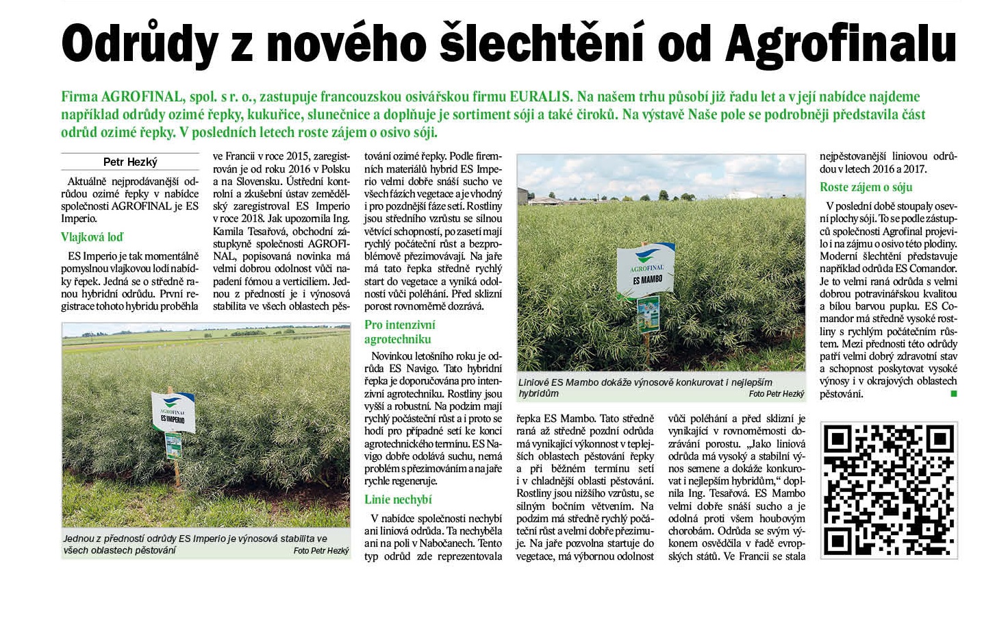 Firma AGROFINAL, spol. s r. o., zastupuje francouzskou osivářskou firmu EURALIS. Na našem trhu působí již řadu let a v její nabídce najdeme například odrůdy ozimé řepky, kukuřice, slunečnice a doplňuje je sortiment sóji a také čiroků. Na výstavě Naše pole se podrobněji představila část odrůd ozimé řepky. V posledních letech roste zájem o osivo sóji.