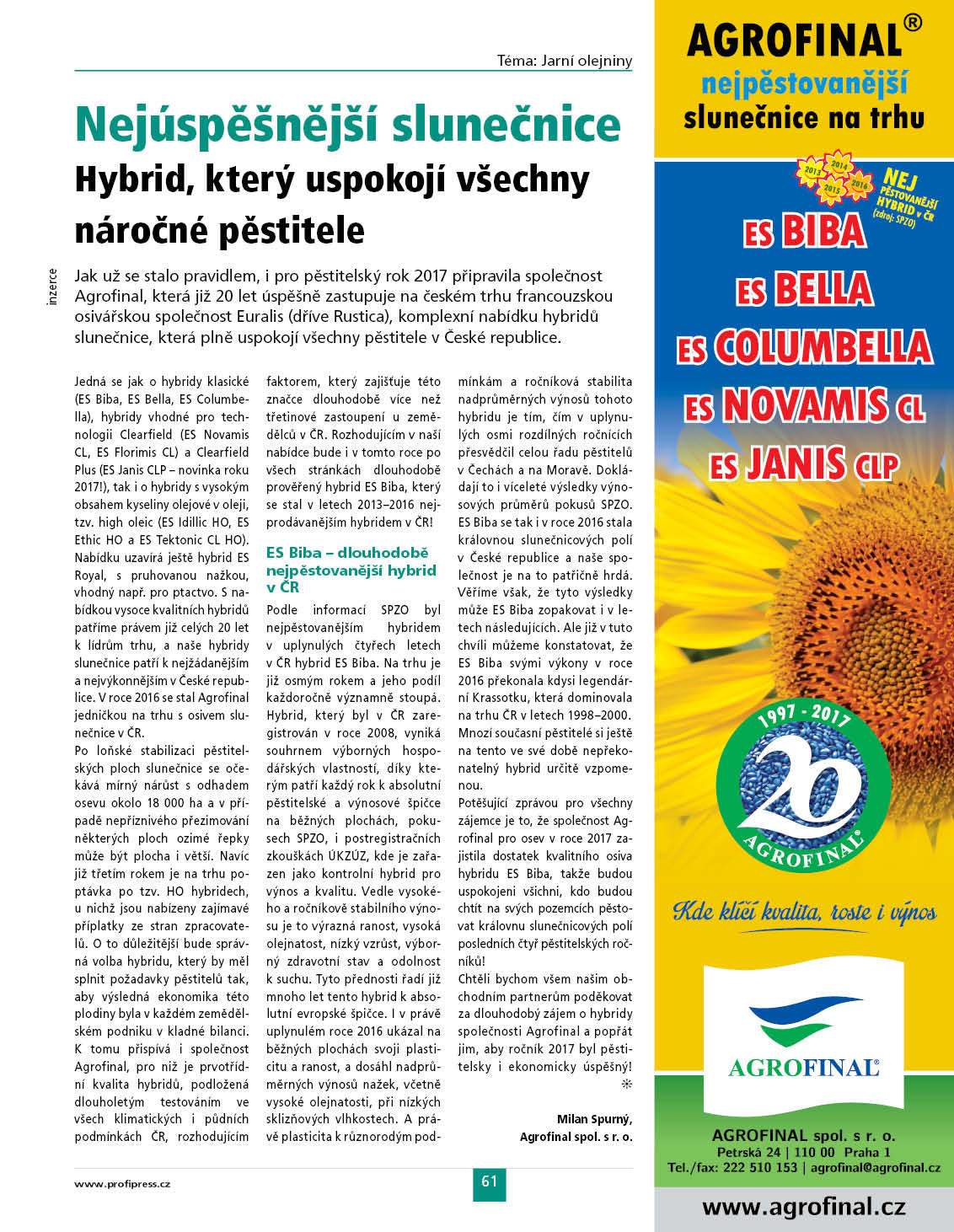 Jak už se stalo pravidlem, i pro pěstitelský rok 2017 připravila společnost Agrofinal, která již 20 let úspěšně zastupuje na českém trhu francouzskou osivářskou společnost Euralis (dříve Rustica), komplexní nabídku hybridů slunečnice, která plně uspokojí všechny pěstitele v České republice.