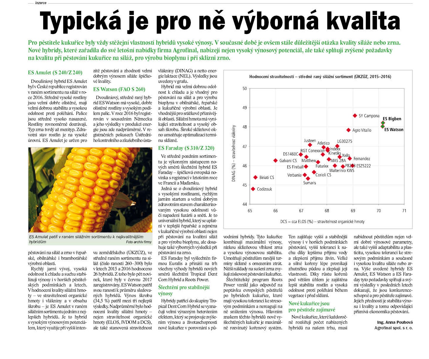 Nové kukuřice, které každoročně rozšiřují počet nabízených hybridů na našem trhu, musí nabídnout pěstitelům nejen velmi dobré výnosové parametry, ale také vyšší adaptabilitu a plasticitu, vysokou toleranci ke stresovým podmínkám a současně i vysokou kvalitu siláže nebo zrna. Výše uvedené hybridy ES Amulet, ES Watson a ES Faraday tyto požadavky splňují a svými výsledky v posledních letech dokazují, že jsou konkurenceschopné a pro pěstitele zajímavé. Jejich předností je stabilita výnosu i kvality a tomu odpovídající příznivá ekonomika pěstování.