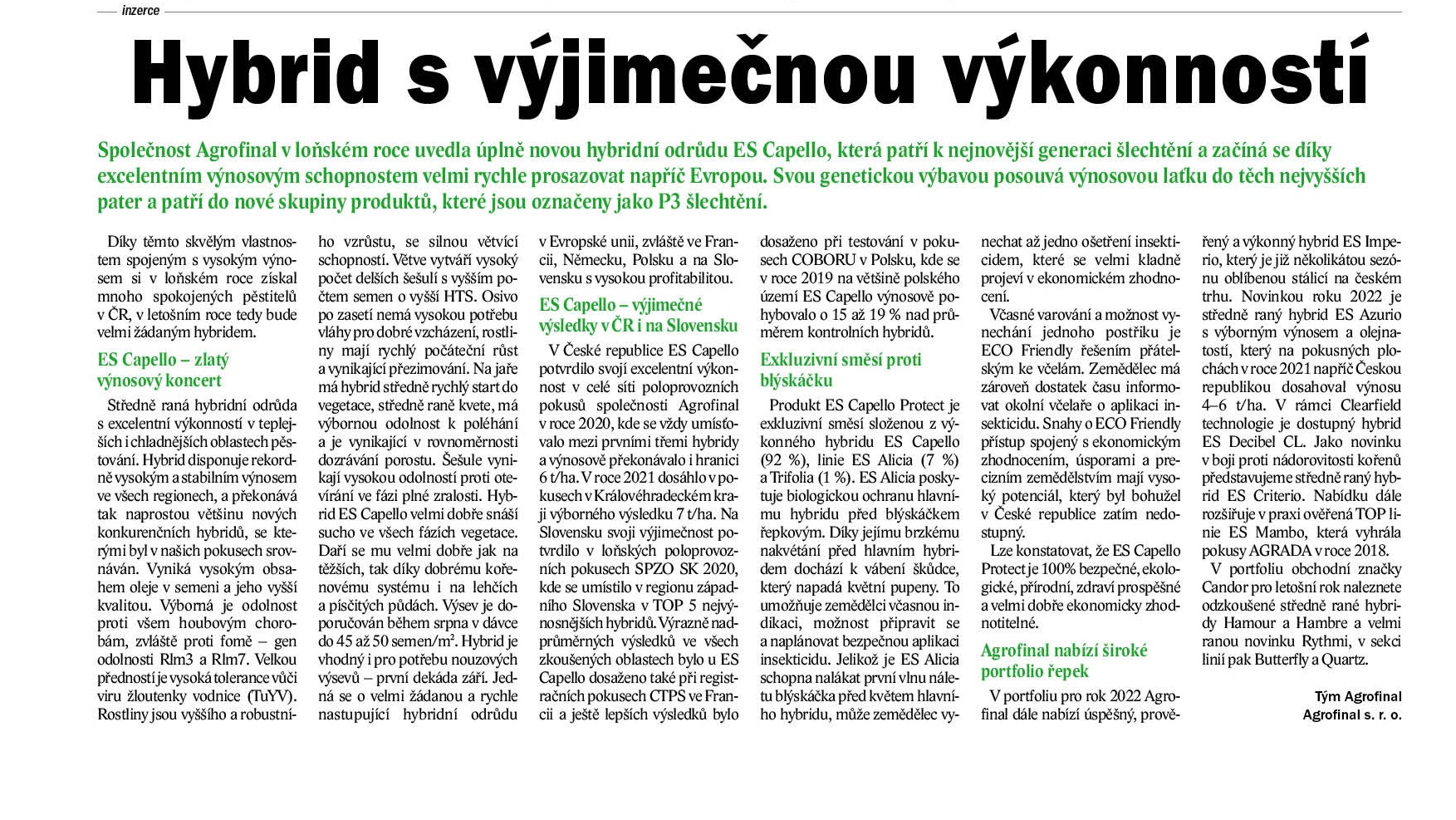 Společnost Agrofinal v loňském roce uvedla úplně novou hybridní odrůdu ES Capello, která patří k nejnovější generaci šlechtění a začíná se díky excelentním výnosovým schopnostem velmi rychle prosazovat napříč Evropou. Svou genetickou výbavou posouvá výnosovou laťku do těch nejvyšších pater a patří do nové skupiny produktů, které jsou označeny jako P3 šlechtění.